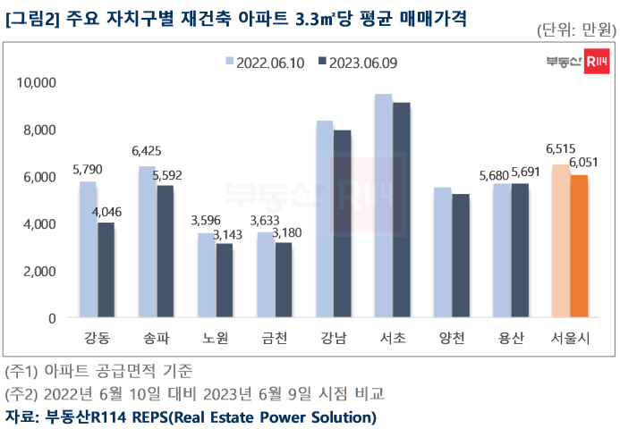 서울 재건축 아파트 3.3㎡당 평균 매매가격은 6,051만원으로 하락기 직전 가격과 비교해 464만원 떨어졌다. 강동이 1,744만원, 송파가 833만원, 노원과 금천이 각각 453만원 격차를 보였다. 하락폭이 컸던 지역일수록 빠른 속도로 가격이 회복되고 있다고 풀이된다.