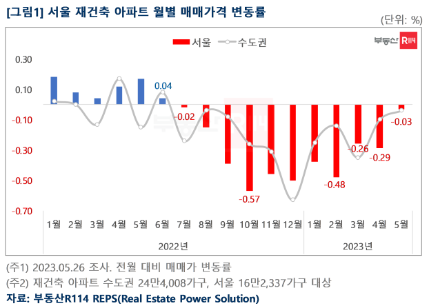 부동산R114가 수도권 재건축 아파트 매매가격 변동률을 조사한 결과, 5월 매매가는 전월 대비 0.04% 하락했다. 지난해 8월(-0.04%) 이후 9개월 만에 낙폭이 가장 낮았다. 1·3대책 이후 가격 급락세는 완화됐으나, 2월 이후 노후계획도시 특별법(1기신도시 특별법)이 가격 흐름에 별다른 영향을 미치지 못하면서 경기 부천, 성남, 수원을 중심으로 수도권 하락폭이 확대됐다. 5월 시중은행 대출금리 조정 기조가 이어졌고 급매물 소진 후 매수심리가 다소 개선되면서 가격 하락폭이 둔화된 것으로 파악된다.