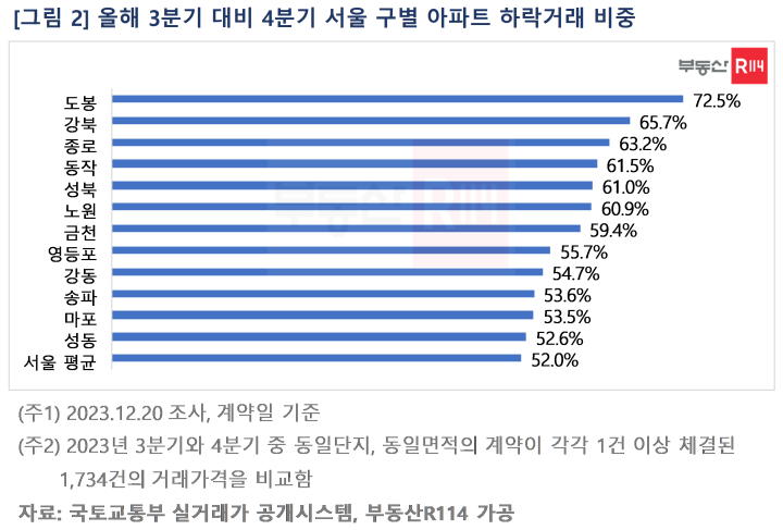 고가지역의 아파트값은 거래가 크게 줄었음에도 중저가 지역에 비해 상대적으로 더디게 빠지는 분위기다. 올해 3분기와 4분기(10/1~12/20)에 각각 매매계약이 1건 이상 체결된 서울 아파트(동일단지 및 동일면적 기준) 1,734개 사례의 실거래가 평균을 분석한 결과, 3분기 대비 4분기 가격이 하락한 거래가 901건(52%)으로, 상승 거래 730(42%)건에 비해 많았다. 지역별로 하락 거래 비중은 △도봉(72.5%) △강북(65.7%) △종로(63.2%) △동작(61.5%) △성북(61.0%) 등 대체로 중저가 지역이 높았다.