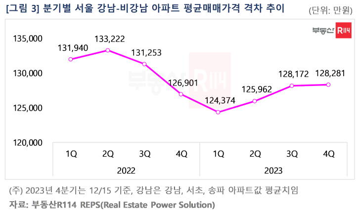 중저가 지역에서 더 큰 폭으로 가격 조정을 받으면서 고가 지역과 아파트값 격차가 벌어지는 분위기다. 고가 아파트가 밀집한 강남(강남, 서초, 송파)과 비강남 아파트간 가구당 평균매매가격 격차는 지난 2분기부터 다시 확대됐다. 상급지로 이동 시 가격 부담이 확대되는 만큼, 1주택자의 갈아타기 움직임이 주춤해지면서 겨울 비수기의 거래 절벽은 계속될 전망이다.