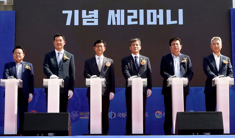 | ▲19일 부산 기장군 부경대학교 수산과학연구소에서 열린 ‘스마트양식 테스트베드 착공식’에서 허윤홍 GS건설 신사업부문 대표(사진 왼쪽에서 두 번째), 송상근 해양수산부 차관(사진 왼쪽에서 세 번째), 이병진 부산광역시 행정부시장(사진 왼쪽에서 네 번째)등 관계자가 기념 세레모니를 하고 있다. <사진제공=GS건설> |