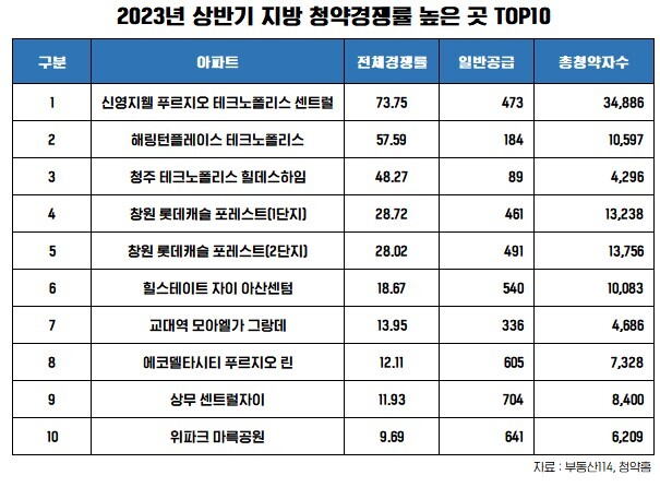 청약 경쟁률이 가장 높았던 3곳은 충북 청주 테크노폴리스에서 분양한 단지다. 거주지역과 관계없이 1순위 청약이 가능한 전국 청약 단지라는 점이 인기를 끌었다는 분석이다. 이 중 신영지웰 푸르지오 테크노폴리스 센트럴이 473가구 일반공급(특별공급 제외)에 3만4,886명이 몰려 73.75대 1의 평균 청약 경쟁률을 기록하며 1위를 기록했고, 해링턴 플레이스 테크노폴리스(57.59대 1), 청주 테크노폴리스 힐데스하임(48.27대 1)이 뒤를 이었다.
