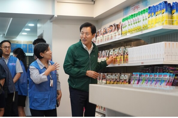 | ▲오세훈 서울시장이 지난 7월20일 용산구 동자동 온기창고 1호점 개소식에 참석해 물품을 살펴보는 모습. 사진=서울시 제공 |