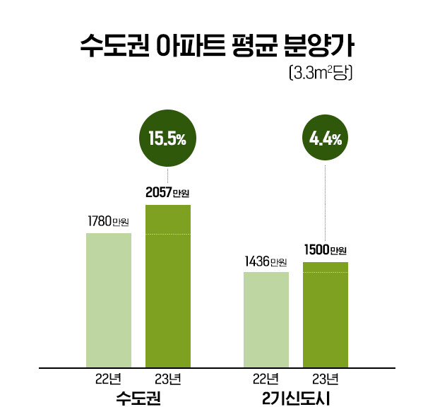 부동산R114에 따르면 올해 수도권(12월 13일 기준)에서 청약을 받은 아파트 분양가는 평균 2057만원(이하 3.3㎡ 기준)으로 나타났다. 2000만원을 넘어선 것은 올해가 처음이다.