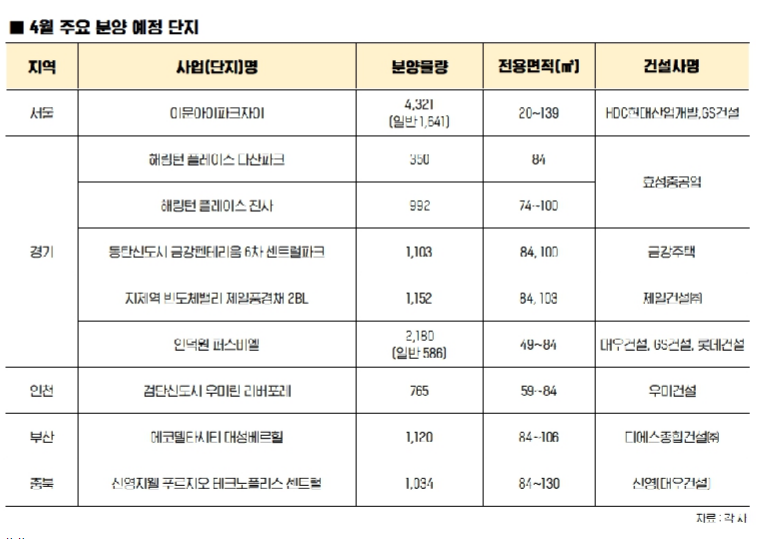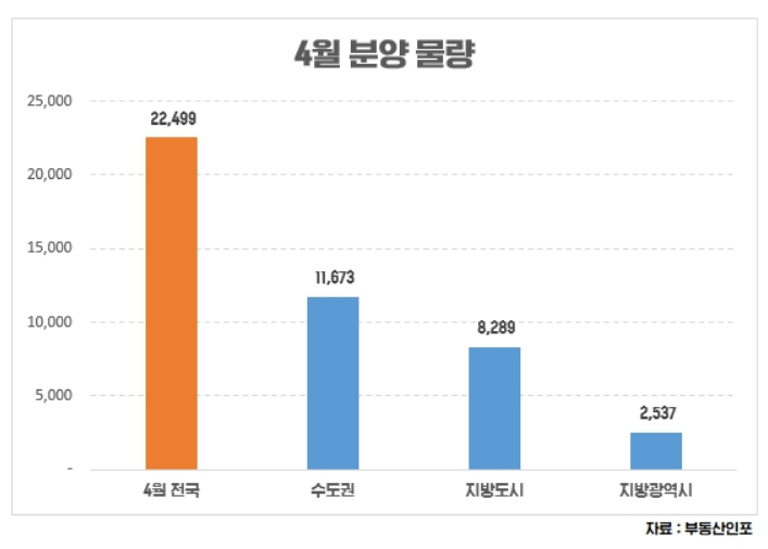 부동산시장 분석업체 부동산인포에 따르면 4월 전국 일반분양은 30곳, 2만 2,499가구로 올해 들어 최고다. 작년 동월(2만 1,770가구)과 비교해도 729가구 늘어난 물량이다. 지역별로는 수도권(1만 1,673가구)이 가장 많고 지방도시(8,289가구), 지방광역시(2,537가구) 순이다.
