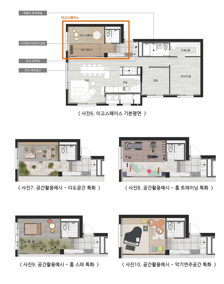 이고스페이스 평면은 기존의 알파룸을 적극적으로 활용해 가족 구성원들과 함께 생활하면서도 취향을 담은 활동에 몰입할 수 있는 나만의 독립된 공간을 원하는 니즈를 반영했다. 이고스페이스와 기존의 거실 사이에 현관에서부터 이어진 이고 테라스라는 공간을 구성해, 주생활공간과 이고스페이스를 완전히 구분하고 온전히 집중할 수 있도록 계획한 것이 특징이다.
