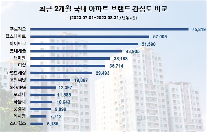 대우건설 아파트 브랜드 '푸르지오'가 지난 7월부터 8월까지 두 달간 국내 주요 건설사의 아파트 브랜드 14개 중 가장 높은 온라인 관심도를 보인 것으로 나타났다. 이어 현대건설 힐스테이트, HDC현대산업개발 아이파크, 롯데건설 '롯데캐슬' 순이었다.