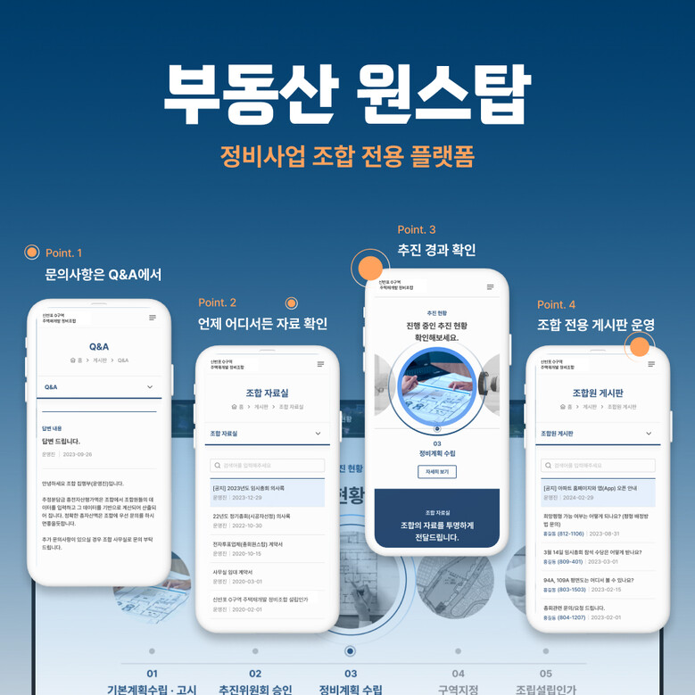 예를 들어 조합원 명부를 플랫폼에 일괄적으로 등록해 관리할 수 있고, 회의록 작성 등 반복 업무가 간편 해진다. 조합의 사업 추진 현황과 이슈를 직관적으로 확인하거나, 전용 자료실에서 공고문이나 계획서 등 관련 서류를 한눈에 모아볼 수 있다. 또 Q&A 페이지에서는 집행부와 조합원 간 소통이 빠르게 이뤄지고, 전용 게시판에서 자유롭게 의견 교류도 가능하다.