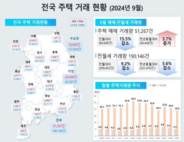 31일 국토교통부가 내놓은 '2024년 9월 주택 통계'에 따르면 전국 주택 매매거래량은 5만1267건으로 전월 대비 15.5% 줄었다. 지난 8월 6만648건으로 7월보다 11.2% 줄어든 데 이어 두달 연속 감소세다.