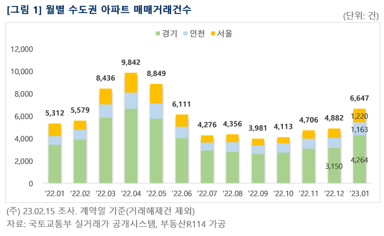 부동산R114(www.r114.com)가 국토교통부 실거래가 자료를 분석한 결과, 2023년 1월 수도권 아파트 매매계약 체결건수는 6,647건으로 집계됐다. 서울과 인천은 작년 6월 이후 7개월 만에 1,000건 이상 매매계약이 이뤄졌으며, 경기는 지난달(3,150건) 거래량보다 35% 증가한 4,264건으로 조사됐다. 1월 계약분에 대한 신고기한(계약 후 30일 이내)이 아직 남아있어 거래건수는 더욱 늘어날 전망이다.