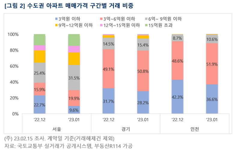 경기와 인천은 3억 초과~6억원 이하 거래가 과반을 넘겼다. 경기는 2021년 최고가 대비 낙폭이 컸던 경기 화성 동탄신도시와 수원 영통구에서 3억 초과~6억원 이하 거래가 활발했으며, 인천도 서구 청라국제도시, 연수구 송도신도시, 남동구 30평대 아파트의 거래가 집중돼 해당 구간 거래 비중이 높았다. 다만 인천은 12억 초과 아파트의 거래가 1월에도 살아나지 못하는 모습이다.