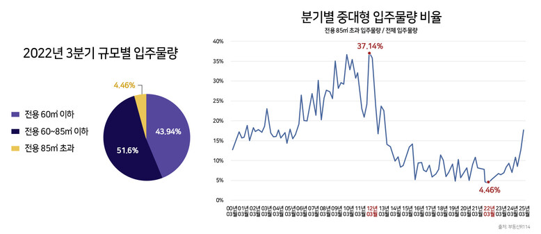 올 3분기 전체 아파트 입주물량 중 중대형 비중이 역대 최저치를 기록하고 있는 것으로 나타났다.