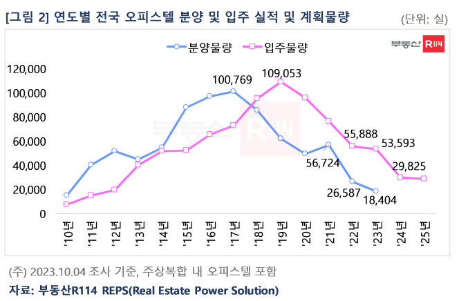수요뿐만 아니라 건설경기 및 수익형 부동산 시장 침체 영향으로 오피스텔 공급량도 감소하는 분위기다. 10월 4일 조사 기준, 2023년 전국 오피스텔 분양물량(예정 포함)은 2022년 실적 대비 8,183실(30.8%) 감소한 1만8,404실로 집계됐다. 작년부터 분양물량이 크게 줄었고, 분양에서 입주까지 2~3년여 정도 소요된다는 점을 감안할 때, 2024년 오피스텔 입주물량은 3만 실 정도에 그칠 가능성이 높다.