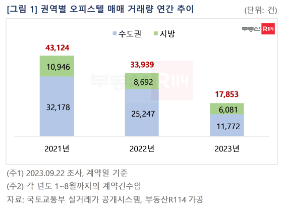 부동산R114(www.r114.com)가 국토교통부 실거래가 자료를 분석한 결과, 1~8월 기준 전국의 오피스텔 매매 거래량은 2021년 4만3,124건, 2022년 3만3,939건, 2023년 1만7,853건으로 감소세를 나타냈다. 오피스텔은 2021년 아파트 시장의 가격 급등, 규제 반사이익으로 거래가 활발했지만, 2022년 들어 오피스텔도 DSR규제 대상에 포함됐고 금리가 빠른 속도로 오르면서 시장이 위축되기 시작했다. 오피스텔 등 비아파트에서 불거진 역전세, 전세사기 위험이 임차수요 감소로 이어지면서 투자 매력을 낮추는 요인으로 작용했다.