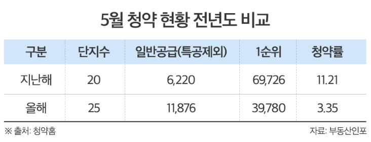 부동산 시장분석업체 부동산인포가 청약홈 청약결과를 분석한 결과 지난 5월, 전국 총 25개 단지에서 1만1,876가구(특별공급 제외)가 분양해 1순위 청약자 3만9,780명이 접수, 평균 3.35대 1 경쟁률을 기록했다. 이는 지난해 5월(6만9,726명. 11.21대 1)과 비교하면 매우 낮은 수준이다.