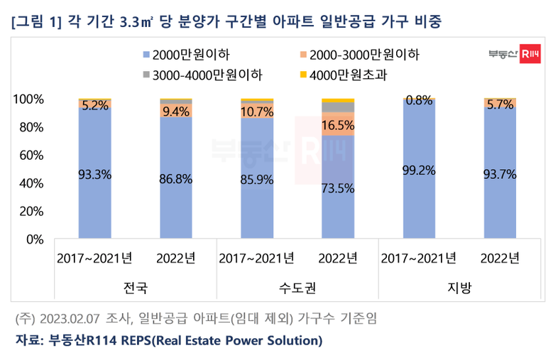 지난해 전국에서 3.3㎡ 당 2,000만원 이하의 가격으로 일반공급된 아파트 비중이 이전 대비 눈에 띄게 감소한 것으로 나타났다. 고금리와 공사비 인상 등에 따른 분양가 상승이 반영된 결과로 풀이된다.