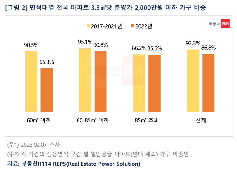 전용면적 구간별로는 전용 60㎡ 이하 소형의 감소폭이 큰 것으로 나타났다. 2,000만원 이하로 공급된 전용 60㎡ 이하 비중은 2017~2021년 평균 90.5%를 차지했으나, 2022년 들어 65.3%로 25.2%p 줄었다. 최근 소형 아파트 분양가가 빠르게 오르는 데다 지난해 서울에서 올림픽파크포레온(둔촌주공)을 포함한 소형 분양물량이 많았던 영향으로 분석된다. 한편 전용 60-85㎡는 3.3㎡ 당 2,000만원 이하 일반공급 가구 비중이 가장 커, 단위면적당 가성비가 상대적으로 높았다.