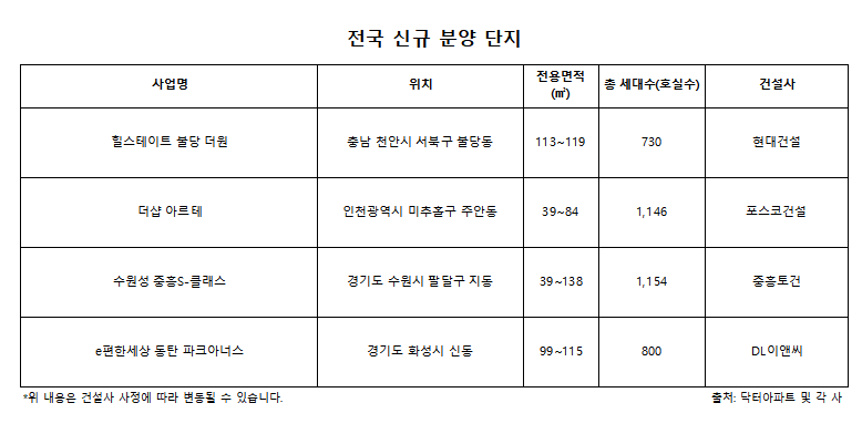 DL이앤씨는 2월, 경기도 화성시 신동 일원에서 ‘e편한세상 동탄파크아너스’를 분양할 예정이다. 단지는 효제봉 자락에 위치해 있고 신리천과 신리제2저수지 등의 녹지가 가까워 주거 환경이 쾌적하다. 또한 인근에 초·중·고교 부지도 계획돼 있어 안전한 통학이 가능하며 롯데백화점, 트레이더스, 이케아 등의 편의시설도 가깝다. 단지는 지하 2층~지상 12층, 13개 동, 전용면적 99~115㎡ 총 800세대 규모로 조성된다.