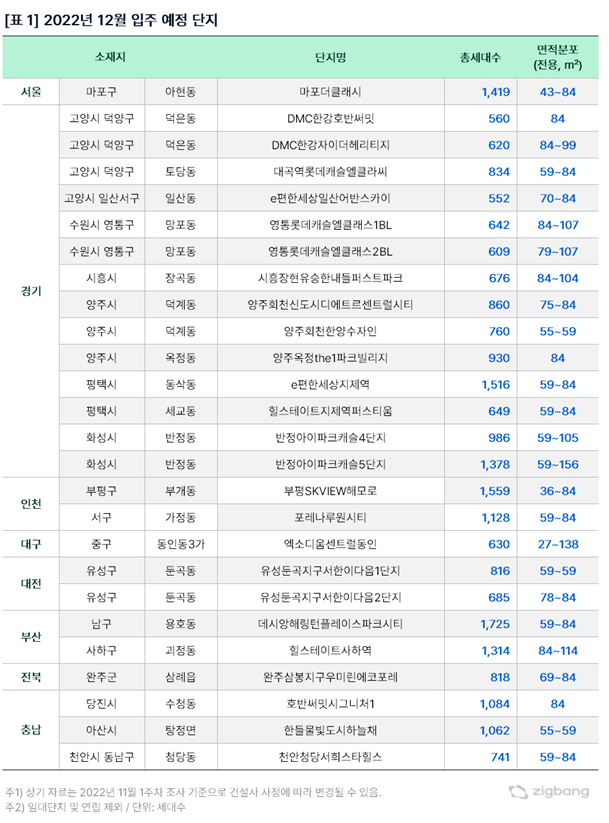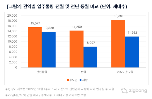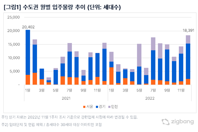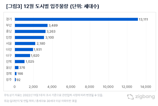 12월은 연내 가장 많은 입주물량이 공급된다. ㈜직방이 조사한 바에 따르면 12월 전국 아파트 입주물량은 총 3만 353세대로 전월(2만 2,347세대), 전년 동월(2만 9,405세대)보다 각각 36%, 3% 가량 많다. 매년 12월은 해를 넘기지 않고 입주하려는 단지가 집중되며 입주물량이 많은 시기로 올해 12월은 수도권 입주물량이 특히 많다. 수도권은 전년(1만 5,577세대) 대비 18%가량 많은 1만 8,391세대가 입주하며 2021년 1월(2만 402세대)이후 가장 많은 물량이 공급된다.