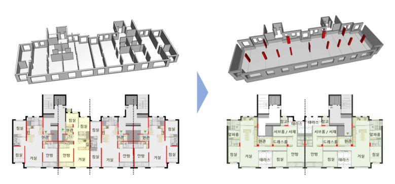 기존의 '리모델링 수직증축'은 하부 구조물의 내력벽을 그대로 수직 연장하다보니 벽체의 좁은 간격 때문에 상부의 수직증축한 구조물의 평면 구성이 다소 제한적이었다.