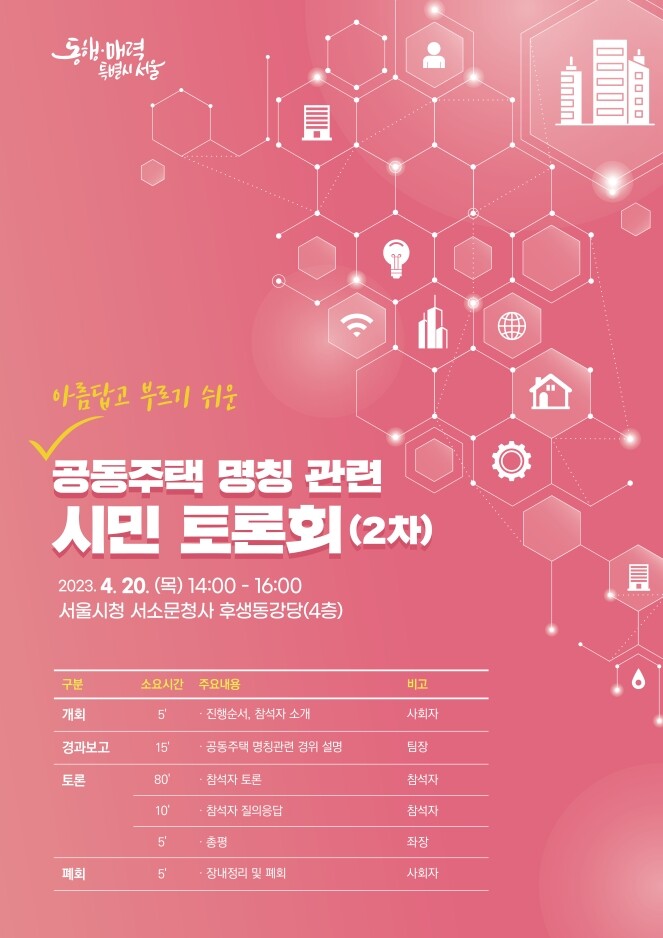 이번 토론회는 공동주택 명칭에 관심이 있는 시민이라면 누구나 참여할 수 있으며, 서울시는 토론회에서 수렴한 의견을 앞으로 공동주택 명칭 관련 정책을 구현하기 위한 자료로 홀용한다는 방침이다.