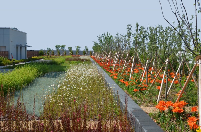 옥상조경에 총 4,000m2의 녹지 조성해 다양한 식물 식재 및 통합 물 순환 시스템 적용