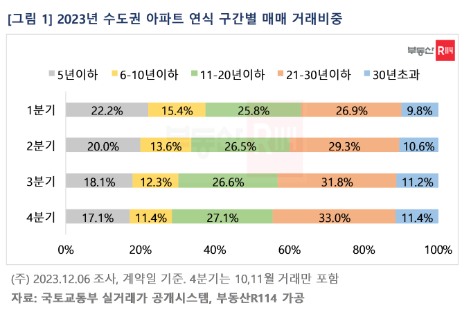 부동산R114(www.r114.com)가 국토교통부 실거래가 자료를 통해 2023년 매매 거래된 수도권 아파트를 연식 구간별로 분석한 결과, 준공 10년 이하 구간에서는 거래비중이 감소세를 보인 반면 10년 초과 아파트에서는 비중이 모두 증가했다. 특히 21-30년 이하 아파트 매매 거래비중은 1분기 26.9%에서 4분기 33.0%로 가장 많이 늘었다(6.1%P). 반면 5년 이하 아파트 거래비중은 4분기 17.1%로, 1분기 22.2% 대비 5.1%P 감소한 것으로 나타났다.