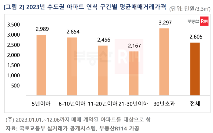 신축에 비해 구축 아파트가 주거 선호도가 낮음에도 불구하고 거래비중이 커진 주 원인은 상대적으로 저렴한 가격에 있다. 주택 시장이 회복되면서 신축 아파트값이 크게 오르자, 매수자들이 구축으로 선회하거나 매수를 보류한 것으로 풀이된다. 실제로 올해 거래된 준공 21-30년 이하 아파트의 3.3㎡당 평균 매매가격은 2,167만원으로, 5년 이하 2,989만원에 비하면 부담이 낮다.