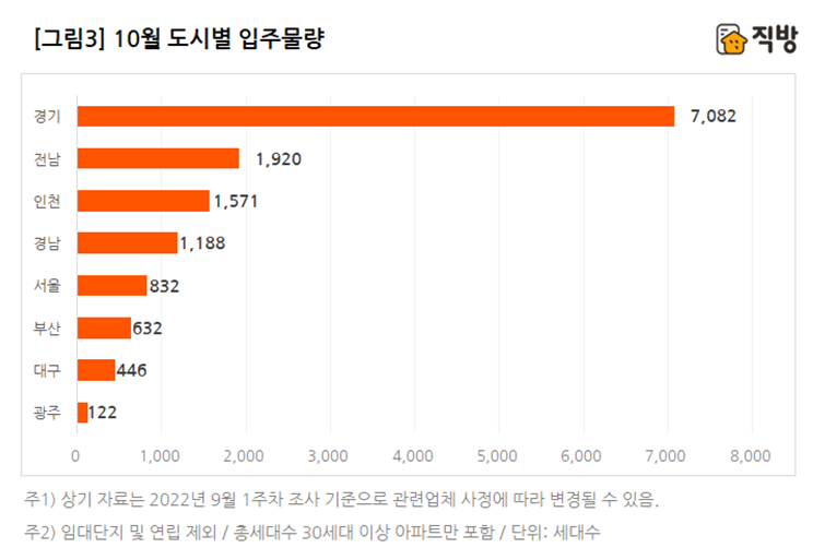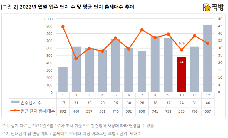 직전 4개월 동안 입주물량 증가세가 이어졌던 가운데 연말 입주물량이 집중되기 전 일시적인 물량 감소인 것으로 보인다. 특히 단지 수도 24개로 적고 입주단지의 규모 또한 평균 575세대로 작은 편이라 입주물량 감소가 두드러진 것으로 보인다.