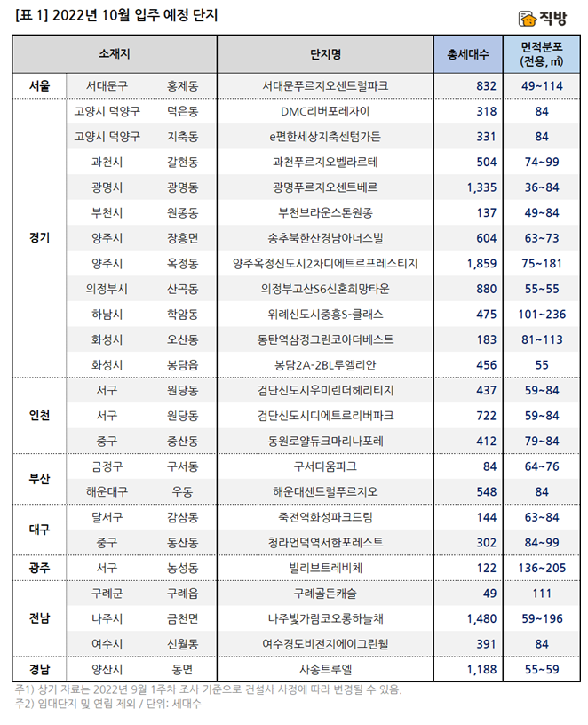 10월은 총 24개 단지가 입주한다. 수도권은 총 15개 단지로 경기 11개 단지, 인천 3개 단지, 서울1개 단지다. 지방은 9개 단지로 전남 3개 단지, 부산 2개 단지, 대구 2개 단지, 광주와 경남에서 각 1개 단지가 입주한다.