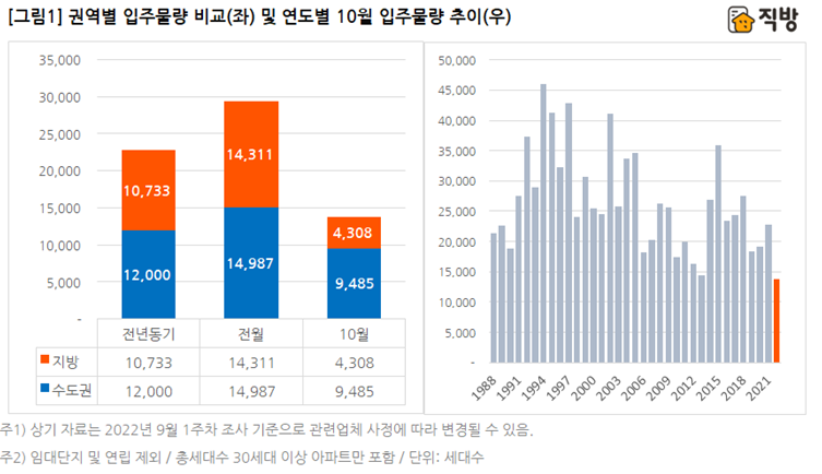 10월은 연내 가장 적은 물량이 입주할 예정이다. ㈜직방이 조사한 바에 따르면 10월 전국 아파트 입주물량은 전월 대비 53%, 전년동기 대비 39% 가량 적은 1만 3,793세대가 공급된다. 이는 올해 중 가장 적은 월별 입주물량이다. 연도별 10월 입주물량으로도 1987년(1만 843세대) 이후 가장 적으며 종전 최저치인 2013년(1만 4,484세대)보다 5%가량 적다.