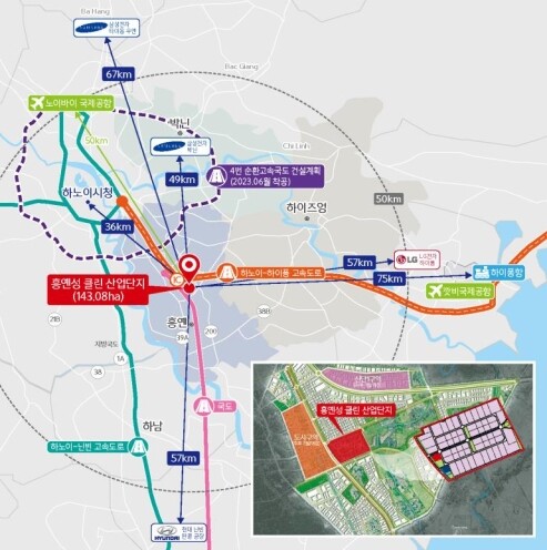 클린산업단지가 위치한 흥예성은 서울의 약 1.5배 면적, 인구 120만명의 도시로 하노이-하이퐁-박닌으로 연결되는 베트남 북부 경제벨트 중심에 위치해 있다.