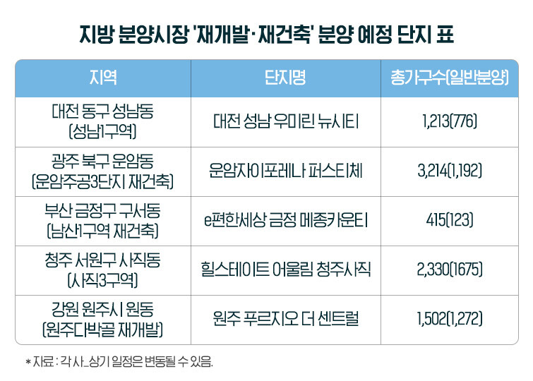 이런 가운데 본격화될 봄 지방 분양시장에도 '재개발·재건축' 분양단지가 곳곳에서 나와 관심이 집중된다. 부동산시장 분석업체 부동산인포에 따르면 내달부터는 대전, 광주, 부산 등의 광역시를 비롯해 청주, 원주 등 중소도시에서도 정비사업 물량이 시장에 나올 예정이다.