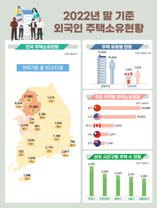 국토교통부는 31일 이런 내용을 담은 '2022년 말 기준 외국인 토지·주택 보유 통계'를 발표했다. 외국인 주택 소유 통계는 윤석열 정부의 국정과제로, 올해 처음으로 공개된 것이다.