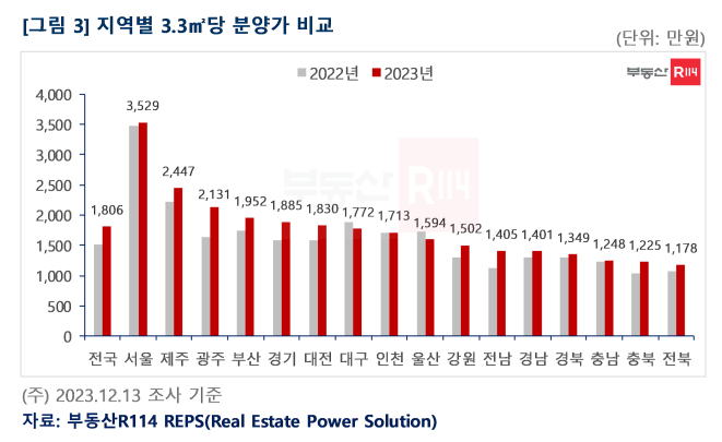 서울의 3.3㎡당 평균 아파트 분양가격은 3,529만원으로 2022년 3,476만원 보다 소폭 상승했다. 한강 이북을 중심으로 신규 분양이 몰렸음에도 마포, 성동, 동대문구 등에서 전용 84㎡ 기준 13~14억원대로 분양가가 책정되며 높은 분양가 수준을 유지했다. 이어 제주의 평균 분양가격은 2,447만원으로 전국에서 두 번째로 높았고 △광주 2,131만원 △부산 1,952만원 △경기 1,885만원 순으로 집계됐다. △울산 △대구 등은 위축된 분양경기가 반영되며 2022년에 비해 분양가격이 낮아졌다.