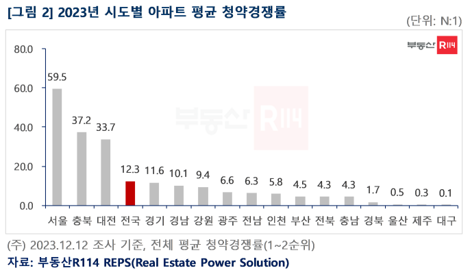 2023년 전국 아파트 평균 청약경쟁률은 12.3대 1로, 2022년(7.5대 1) 대비 소폭 상승하며 두 자릿수를 회복했다. 하지만 지역별 청약양극화는 더욱 심화된 것으로 나타났다. 평균 청약경쟁률이 전국 평균을 상회한 지역이 2022년 8곳에서 2023년 3곳에 불과했고, 1대 1 청약경쟁률에 못 미친 미달 지역은 2곳에서 3곳으로 확대됐다.