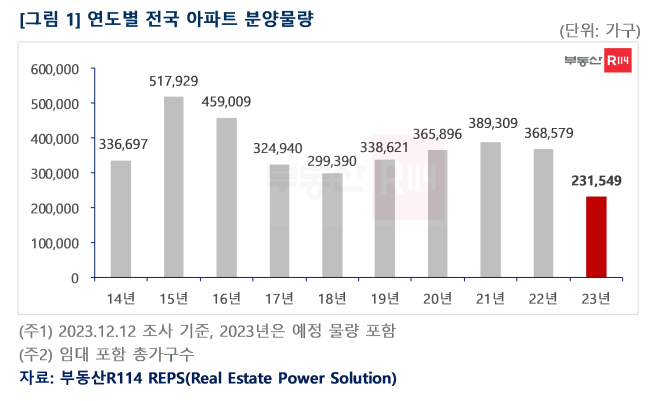 2023년에는 전국에서 23만1,549가구(예정물량 포함)가 공급됐다. 2010년 17만2,670가구 이후 13년만에 최저 수준이다. 2023년 상반기 분양실적은 7만4,723가구로 2022년(16만5,436가구) 같은 기간 대비 45% 수준에 그쳤다. 미분양으로 인한 자금흐름 악화와 원자잿값 및 인건비 인상 등에 따른 분양가 상승 압력이 커짐에 따라 건설사들의 분양 지연 사례가 늘어난 영향이 크다.