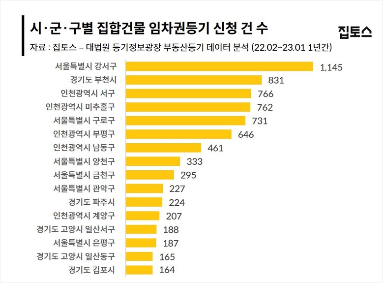 최근 1년간의 집합건물 임차권등기 신청 부동산 수를 살펴보면, 전국 14,297건 중 수도권이 11,218건으로 78%를 차지했다. 시군구별로는 서울 강서구가 1,145건으로 가장 많았으며 이어 경기도 부천시가 831건, 인천 서구가 766건, 미추홀구가 762건, 서울 구로구가 731건으로 뒤를 이었다. 서울 강서구와 경기도 부천시에서는 최근 2달 간 국토교통부 실거래가 기준 2년 전 집합건물 전세계약 수 5,861건의 약 11%인 639건이 임차권등기 신청으로 이어질 정도로 보증금 미반환 사례가 빈번히 발생하는 것으로 나타났다.