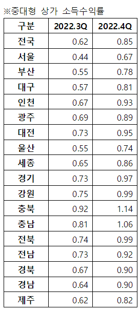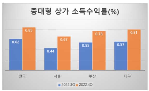 중대형 상가의 소득수익률이 높아진 것은 고금리 등으로 전반적으로 자산가치 변동을 나타내는 자본수익률은 일제히 하락했으나 임대이익에 영향을 주는 임대료가 보합 혹은 상승하면서이다.