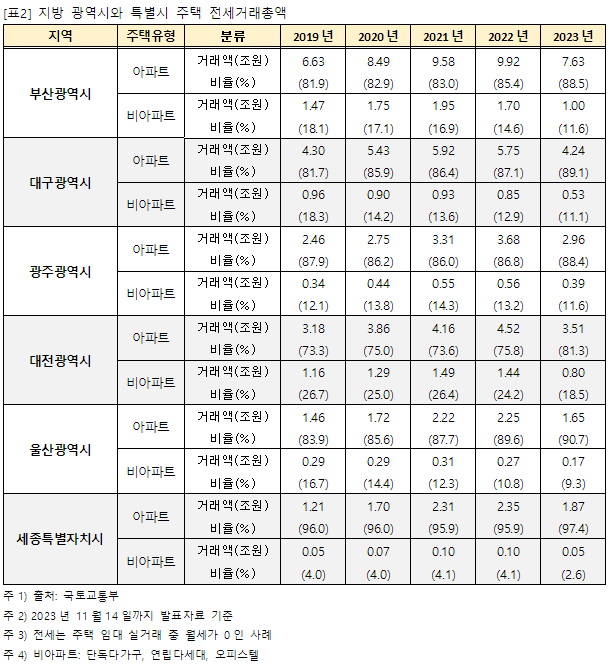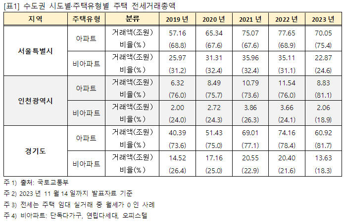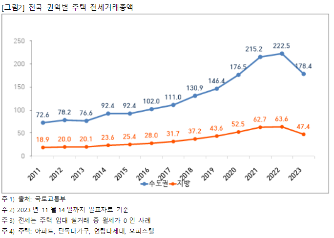 2023년 권역별 주택 전세거래총액은 수도권 178.4조원, 지방 47.4조원으로 조사됐다. 비중은 수도권 79.0%, 지방 21.0%로 나타났다. 지방 주택전세거래총액 비중은 2014년 20.3% 이후 가장 낮은 수치이다. 2022년의 22.2%에 비해 1.2%P 낮아져 "2015년 전년 대비 1.3% 증가한 이후 가장 큰 폭의 변화가 나타났다.