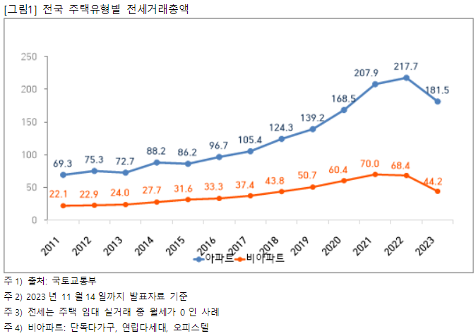 올해 전국 주택 전세거래총액은 아파트 181.5조원, 비아파트 44.2조원으로 조사됐다. 비중을 살펴보면 아파트 80.4%, 비아파트 19.6%다. 주택 전세거래총액에서 비아파트 비중이 20% 미만으로 떨어진 경우는 2011년 주택 임대실거래가가 발표된 이후 2023년이 처음이다. 전세시장이 아파트 전세시장은 2023년 들어 가격이 상승하며 회복세를 보였으나, 비아파트 전세시장의 침체는 장기화되고 있다. 비중도 줄어들고 전체 거래 규모도 크게 줄어들었다.