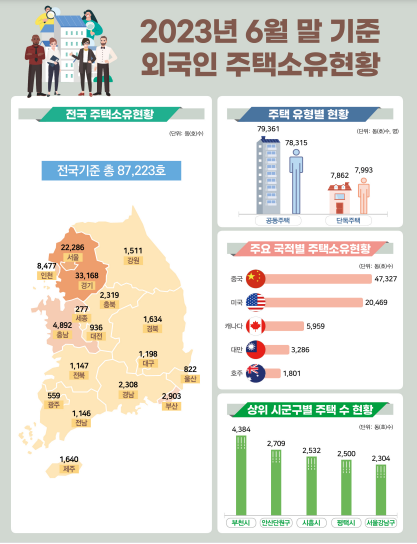 국내에 주택을 소유한 외국인은 8만5358명으로, 6개월 전보다 3732명(4.6%) 늘었다. 이들이 소유한 주택은 우리나라 전체 주택의 0.46% 수준이었다. 국적별로는 중국인이 4만7327가구(54.3%)로 가장 많았고, 다음으로는 미국인(2만469가구·23.5%), 캐나다인(5천959가구·6.8%), 대만인(3천286가구·3.8%) 순이었다.