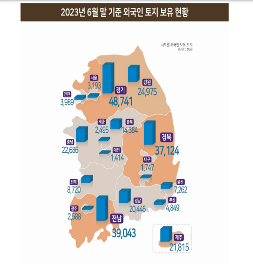 국젹별로는 미국인이 외국인 전체 보유면적의 53.4%(1억4168만㎡)를 차지하고 있으며, 이어 중국인(7.8%), 유럽인(7.1%), 일본인(6.2%) 순으로 보유 토지가 많았다. 지역별로는 경기도 소재 토지가 외국인 보유 전체 토지 면적의 18.4%(4874만1000㎡)로 가장 많았고, 이어서 전남(14.7%), 경북(14.0%) 순으로 보유 면적이 컸다.