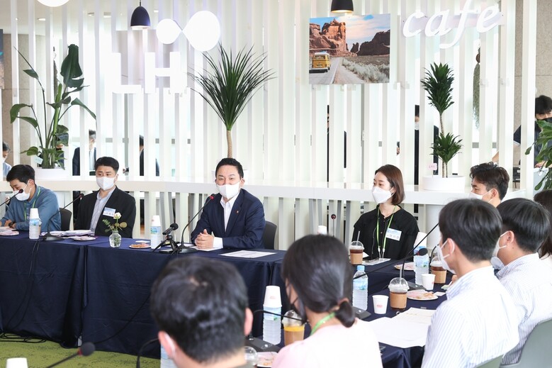 원희룡 국토교통부 장관이 한국토지주택공사(LH) 본사를 방문해 LH 내부 혁신과 관련해 청년 직원들과 소통하는 시간을 가졌다.