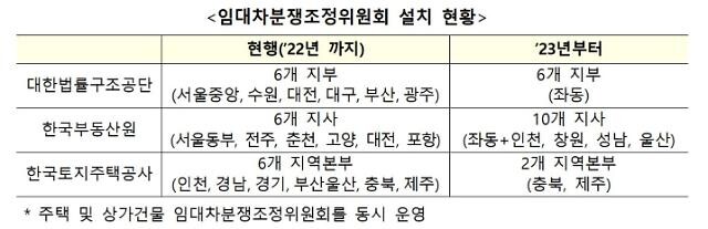 내년부터는 이에 따라 대한법률구조공단이 6개 지부(서울중앙,수원,대전,대구,부산,광주), 한국부동산원이 10개 지사(서울동부, 전주, 춘천, 고양, 대전, 포항, 인천, 창원, 성남, 울산), 한국토지주택공사가 2개 지역본부(충북, 제주) 임대차분쟁조정위를 운영하게 된다.
