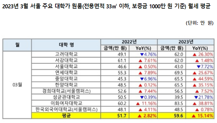 원룸 평균 월세가 60만 원 이상인 대학가는 지난해 3월 기준 2곳(서강대학교, 이화여자대학교 인근)에서 올해 동 월 6곳으로 늘었다. 이 중 이화여자대학교 인근 지역의 평균 월세가 83.5만 원으로 가장 높았으며, 연세대학교 인근(평균 월세 69.5만 원), 중앙대학교와 한양대학교 인근(평균 월세 각각 65.5만 원), 고려대학교와 서강대학교 인근(평균 월세 각각 62만 원)이 뒤를 이었다.