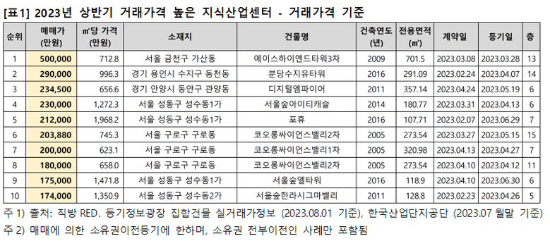 2023년 상반기 가장 높은 가격에 거래된 지식산업센터는 금천구 가산동에 위치한 에이스하이엔드타워3차였다. 지난 3월 13층 전용면적 701.5㎡가 50억 원에 거래됐다. 그 다음으로 용인시 수지구 동천동 분당수지유타워 14층 전용면적 291.09㎡가 2월 29억 원에 거래됐으며, 안양시 동안구 광안동 디지털엠파이어 전용면적 357.14㎡가 4월 23억 4,500만 원에 거래됐다.