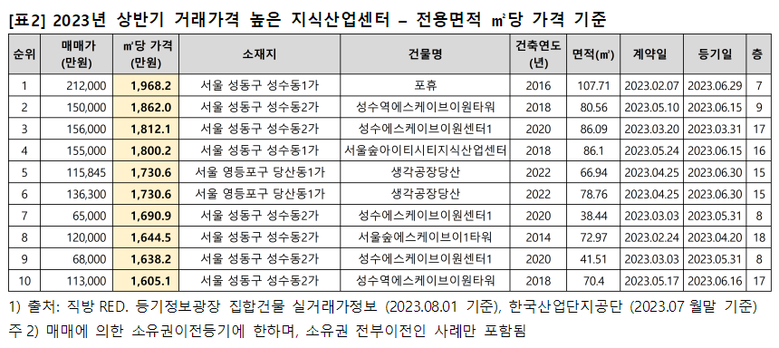 같은 시기, 전용면적 ㎡당 가격 기준으로 가장 높은 가격에 거래된 지식산업센터는 성동구 성수동1가 포휴였다. 2월 7층 전용면적 107.71㎡가 21억 2,000만 원에 거래되었으며, 전용면적 ㎡당 가격은 1,968.2만 원이었다. 2위는 성동구 성수동2가 성수역에스케이브이원타워 전용면적 80.56㎡로, 5월 9층이 15억 원에 거래되어 전용면적 ㎡당 가격은 1,862만 원을 기록했다. 3위는 전용면적 ㎡당 가격이 1,812.1만 원이었던 성동구 성수동2가 성수에스케이브이원센터1이었다. 전용면적 86.09㎡가 3월에 15억 6,000만 원에 거래됐다.