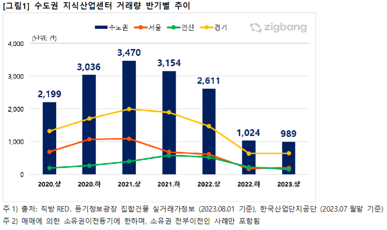 수도권 지식산업센터 거래량은 2021년 상반기까지는 크게 증가하다가 2021년 하반기부터 감소추세가 나타나며 2022년에는 크게 줄었다. 2022년 상반기는 2,611건 거래되며 직전 반기 대비 17.2% 감소했으며 2022년 하반기에는 1,024건 거래로, 직전 반기 대비 60.8% 감소했다. 금리인상으로 금융비용 부담이 증가함과 동시에 공급과잉에 공실마저 늘어나면서 거래가 위축된 것으로 보인다. 2023년 들어서는 서울, 경기지역 거래량이 소폭 늘었고, 본 통계 특성상 등기 전 거래는 아직 포함되지 않아 2023년 상반기 거래량은 소폭 회복세가 예상된다.