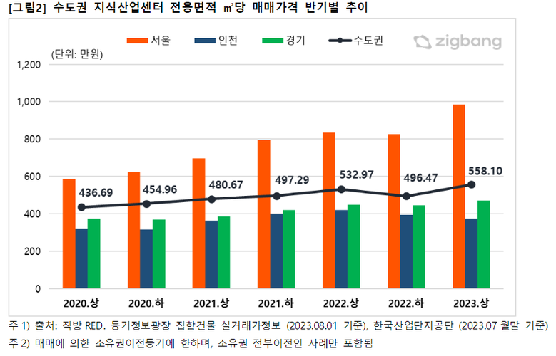 수도권 지식산업센터의 전용면적당 매매가격은 거래량과는 달리 상승세를 보이고 있다. 인천지역 지식산업센터는 2022년 하반기부터 약세를 보이고 있지만 서울과 경기지역 지식산업센터 거래가격이 상승세를 유지하고 있다. 전반적인 경기가 좋지 못한 상황에서 입지 등 상대적으로 우위에 있는 건물 위주로 거래되면서 거래 가격은 상승세를 유지하는 것으로 보인다.